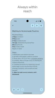 Din digitale notatblokk er alltid der du er. Google Keep synkroniseres sømløst på tvers av alle enhetene dine – telefoner, nettbrett, datamaskiner og Wear OS-klokker. Dette betyr at notatene og listene dine alltid er oppdaterte og tilgjengelige, uansett hvilken enhet du bruker. Og Google Keep er smartere enn bare en notatbok; sett opp stedsbaserte påminnelser som vekker opp handlelisten din akkurat når du ankommer butikken, eller minner deg om en oppgave når du kommer hjem. Med Google Keep får du alltid riktig informasjon til rett tid, nøyaktig der du trenger den.