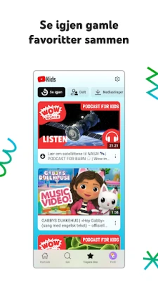 YouTube Kids lar barna trygt utforske videoinnhold tilpasset deres alder og interesser. Med enkle verktøy og personlige profiler kan barn oppdage nye områder, slippe fantasien løs og bygge selvtillit. Foreldre får ro i sjelen med tilpassbare innholdsfiltre som kan justeres etter hvert som barna vokser.